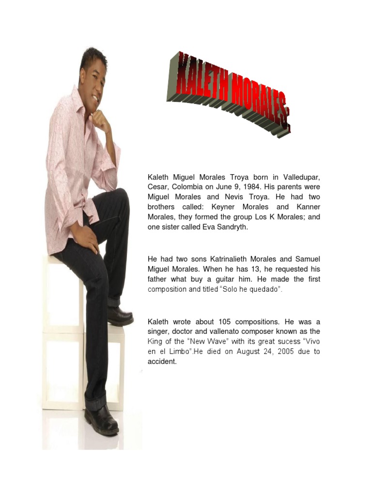 Kaleth miguel morales troya , mejor conocido en el mundo de la música como kaleth morales , fue un reconocido cantante, compositor y médico colombiano, calificado por sus fanáticos como el rey de la nueva ola del vallenato juvenil. Su hija katrinalieth morales conocida como la chacha de las mujeres. La hija de kaleth morales debuta como cantante con el álbum 'legado'. Katrinalieth morales — el pirata 03:47. Katrinalieth morales — en busca de un perdón 04:34.